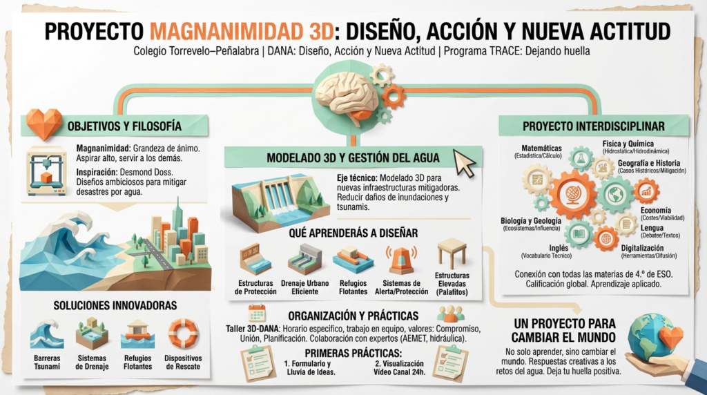 En este curso vas a participar en DANA: Diseño, Acción y Nueva Actitud, un proyecto de innovación y liderazgo juvenil del Colegio Torrevelo‑Peñalabra. Este proyecto forma parte del programa TRACE: Dejando huella, y tiene como objetivo que utilices el diseño en 3D para pensar soluciones reales ante desastres ambientales.