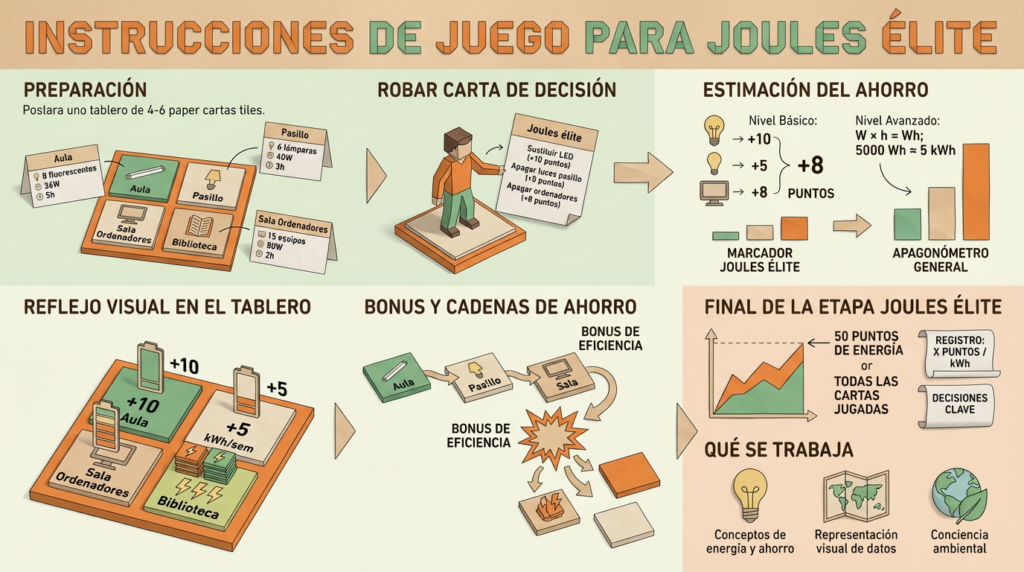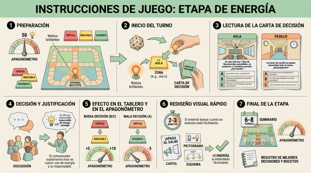 Después de un número fijado de turnos (por ejemplo, 6–8), se revisa el tablero: cuántas casillas han pasado a eficientes y en qué nivel está el Apagonómetro.