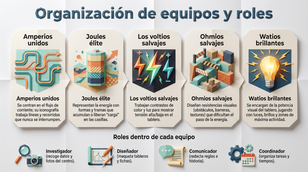 Dentro de cada equipo, los alumnos mantienen roles: investigador (recoge datos y fotos del centro), diseñador (maqueta tableros y fichas), comunicador (redacta reglas e historia) y coordinador (organiza tareas y tiempos)