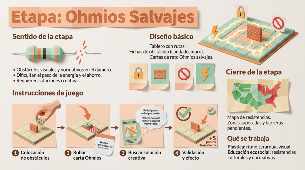 Esta etapa encaja muy bien como el “modo desafío” del tablero, liderado por Ohmios salvajes, que representan las resistencias del sistema.