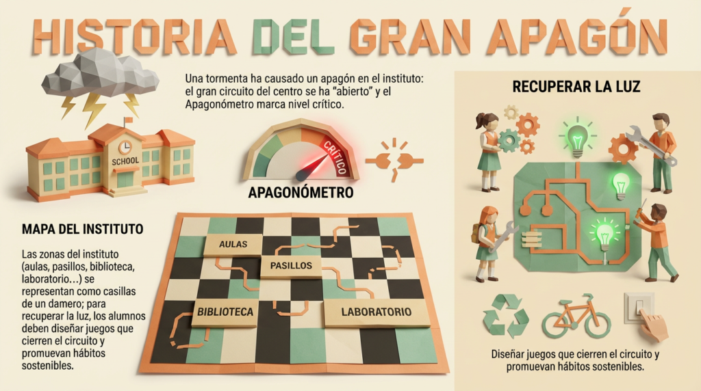 Las zonas del instituto (aulas, pasillos, biblioteca, laboratorio…) se representan como casillas de un damero; para recuperar la luz, los alumnos deben diseñar juegos que cierren el circuito y promuevan hábitos sostenibles.