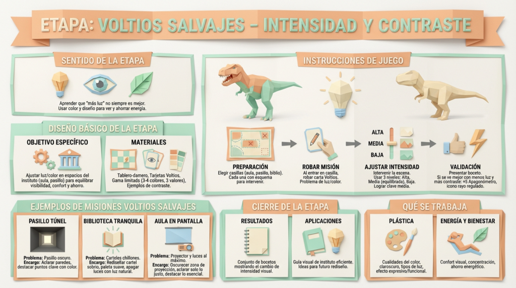 Si quieres, se puede generar ahora un pequeño “modo Voltios salvajes” listo para el manual: 1 página con objetivo, pasos, una carta de misión modelo y una plantilla de casilla para que el alumnado intervenga.