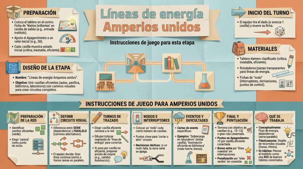 En esta etapa, el objetivo no es solo mejorar casillas sueltas, sino conectar visualmente varias zonas eficientes para formar una “línea de energía” continua a través del instituto. Se trabaja la idea de circuito en serie/paralelo a nivel gráfico: si una zona “se rompe”, la línea se interrumpe y la energía deja de llegar.