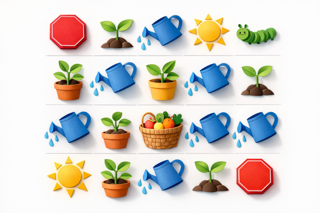1. Se extrae una carta de necesidad (por ejemplo: “La planta tiene sed”, “Hay que plantar”, “Demasiada agua”).